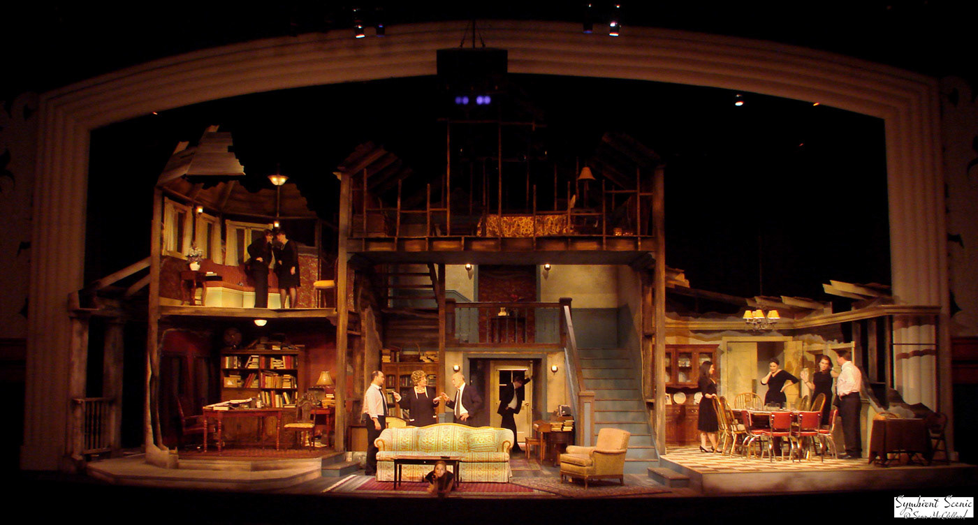Design Concept: The three story house is employed as a visual metaphor for the decaying mind of the family's Matriarch Violet as her senility fades as the play progresses and tragic family secrets are revealed. Within the firm foundation of the house, as you go up walls peel away to decades of past paint treatments, wallpaper, plaster, house planking, and negative space.