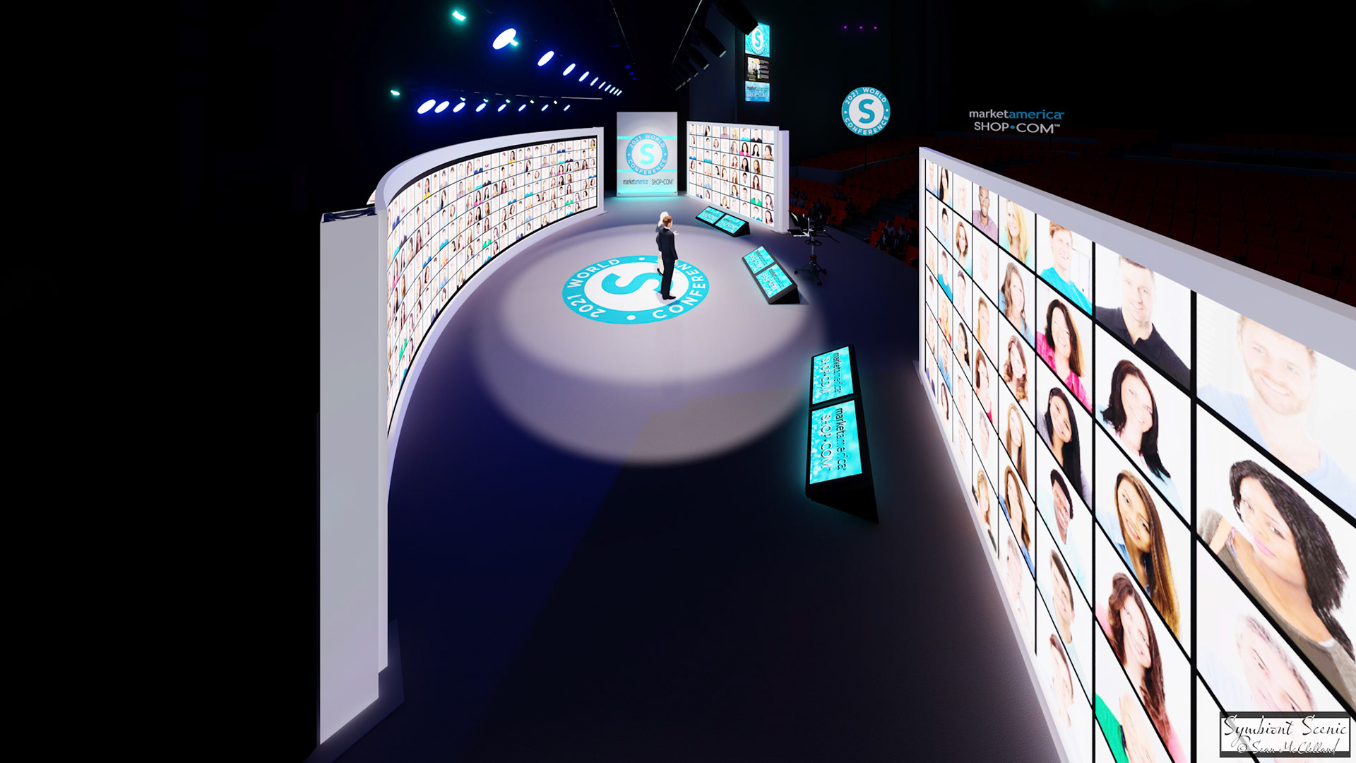 I was again tasked with providing full CAD support for the show layout with all departments and scenic build, visual renderings, and a 3D walk through to "sell" the Production to Market America for Ashley Events. Due to Covid, a normally stadium show was brought into the Tanger Center with an interactive online Tv Studio set up. I collaborated closely with Producer Howard Spector and Johnney Rusignuolo to help shape and bring their vision and function for the show into a Proscenium theatre stage while creating an immersive interactive online experience. This being the second time around for this set up, Market America wished to change things up a bit and make the Live stream event feel more encompassing and intimate. So we added two downstage screens, and shifted the scenic to create a bowl layout.